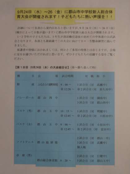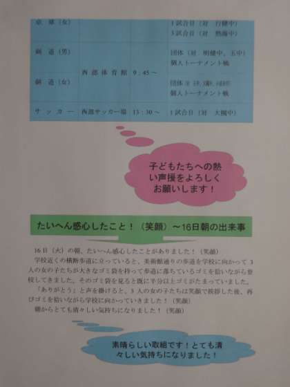 記事の内容は「『県中・県南中学校新人陸上競技大会』で陸上部2名の子どもたちが県大会出場決定!(拍手)」「9月24日(水)〜26日(金)に郡山市中学校新人総合体育大会が開催されます!子どもたちに熱い声援を!!」「たいへん感心したこと!(笑顔)〜16日朝の出来事」です。