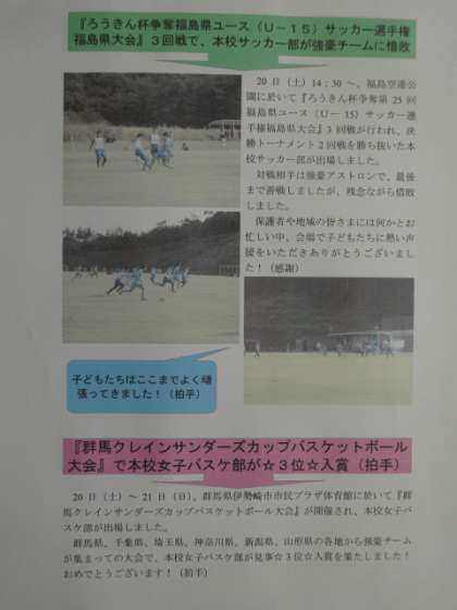 記事の内容は「『生徒会役員改選立会演説会』が開かれる」「『ろうきん杯争奪福島県ユース(U−15)サッカー選手権福島県大会』3回戦で、本校サッカー部が強豪チームに惜敗」「『群馬クレインサンダーズカップバスケットボール大会』で本校女子バスケ部が☆3位☆入賞(拍手)」です。
