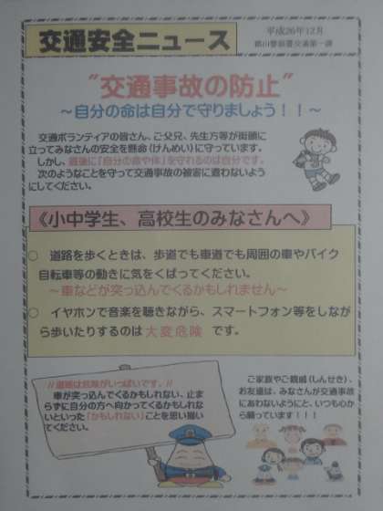 先日、郡山警察署より市教委を通して「児童・生徒に対する交通安全指導の徹底について」の依頼があり、交通事故の防止に向けた指導の資料として『交通安全ニュース12月号』(郡山警察署交通第一課)が届きました。