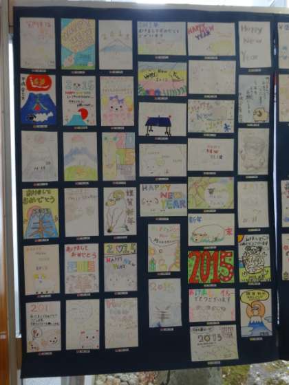3年昇降口付近(職員室近辺)に「子どもたちのユニークな年賀状」(美術科作品)が掲示されています。子どもたちの個性がデザイン、色彩などに表れ、とても素晴らしい作品となっています。このような年賀状が届いたらとても嬉しいですね。