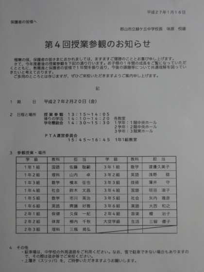 本日お子さんをとおして『第4回授業参観のお知らせ』を配付いたしました。今年度最後の授業参観(2月20日(金))になります。お子様の一年間の成長をご覧いただきたいと思います。