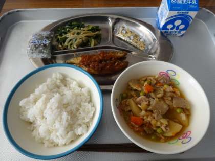 1月19日(月)、今週最初の給食のメニューは、「麦ごはん(たまごふりかけ付)、豚肉とじゃが芋の南蛮煮、ししゃもの甘酢漬け、小松菜ののり和え、牛乳」です。