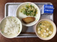 今日の給食は、ごはん、カリッと揚がった鮭フライ、シャキシャキ食感のキャベツと小松...