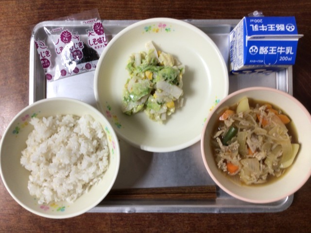 今日の給食は、麦ごはん、しそ香り広がるご飯がすすむしそひじき、甘めで汁までおいし...