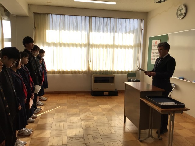 校長先生の式辞では、「徳樹祭」などの学校行事、3年生から引き継いだ生徒会や部活動で皆が本気で頑張ったことが成果となり、成長を実感できた2学期であったこと。各学年でのさらなる頑張りに期待が込められたお話がありました。