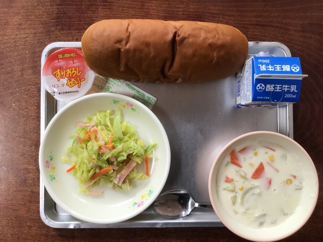 今日の給食は、ほんのり甘い黒糖パン、野菜サラダ、パンとの相性がとても良いホワイトシチュー、りんごゼリー、牛乳です。総カロリー817kcal。