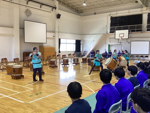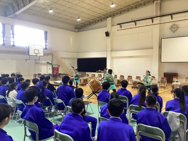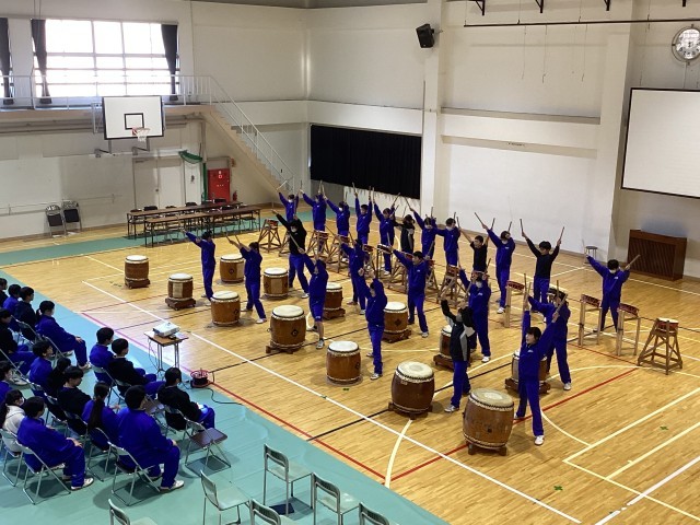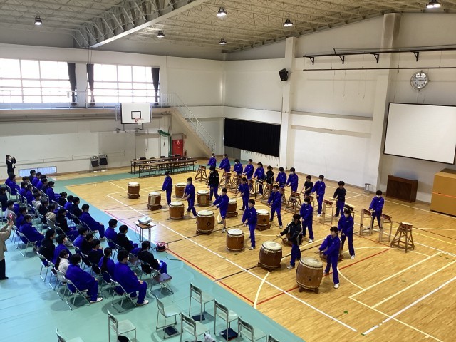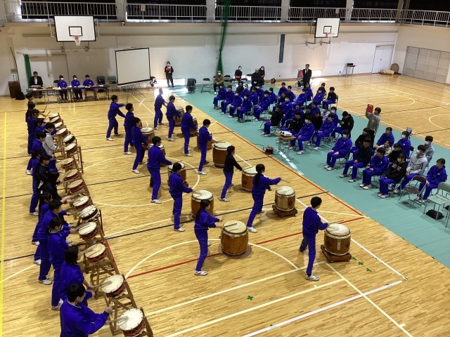 開湯太鼓保存会のみなさんから、3年生へのお祝いの演奏を皮切りに、1年生、2年生が演奏を贈りました。