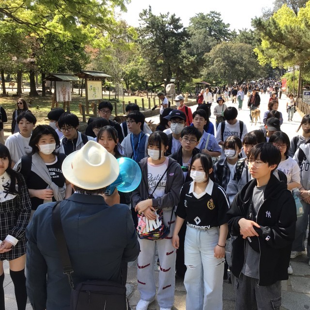 奈良公園に到着。東大寺南大門の金剛力士像見学です。ガイドさんのはなしをよく聞いて学習しています。