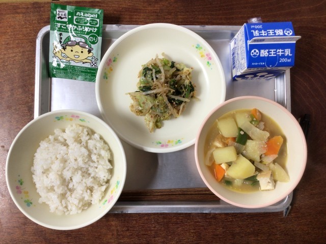 今日の給食は、麦ご飯、生揚げの出汁が出た甘めのつゆがおいしい生揚げのみそ煮、春キャベツのおひたし、鉄分とカルシウムたっぷりのふりかけ、牛乳です。総カロリー827kcal。