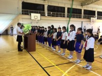全校生徒の前で各学年の代表の野地さん,原さん,渡邉さんが,2学期の反省を行いました。