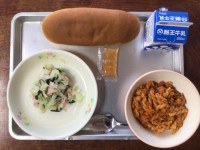今日の給食は、生徒に人気のマカロニのミートソース煮とミートソースとの相性バッチ...