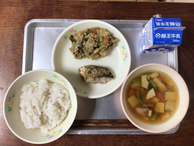 今日の給食は、麦ご飯、ねぎ味噌の香りが広がるサバの三味焼き、うの花入り、里芋が...