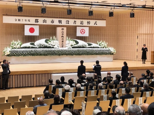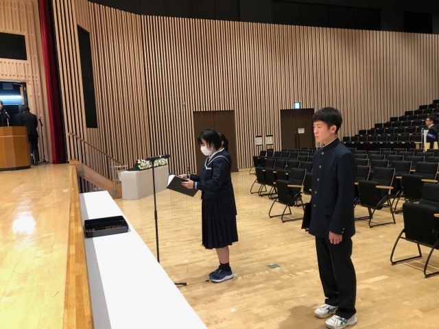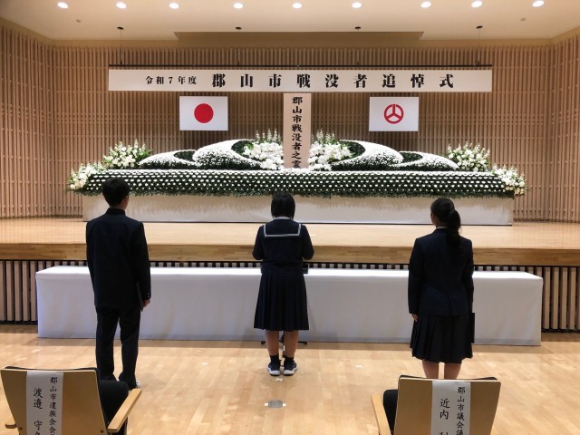 令和7年度郡山市戦没者追悼式が中央公民館で行われ、中学生長崎派遣団員として研修を受けた中から代表生徒3名が、「平和へのメッセージ」を発表しました。代表生徒には本校生徒も選ばれ、「~過去から未来へ~」と題したメッセージの発表と献花を行いました。