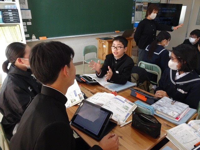 「結露が生じる理由について説明し、それを元に結露を防ぐ具体策を提案しよう。」という学習課題の解決に向けて、飽和水蒸気量のとらえ方をもとに班ごとに具体策を考えています。