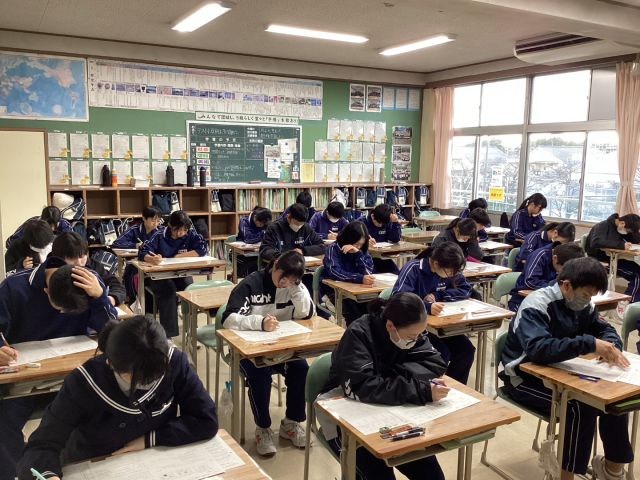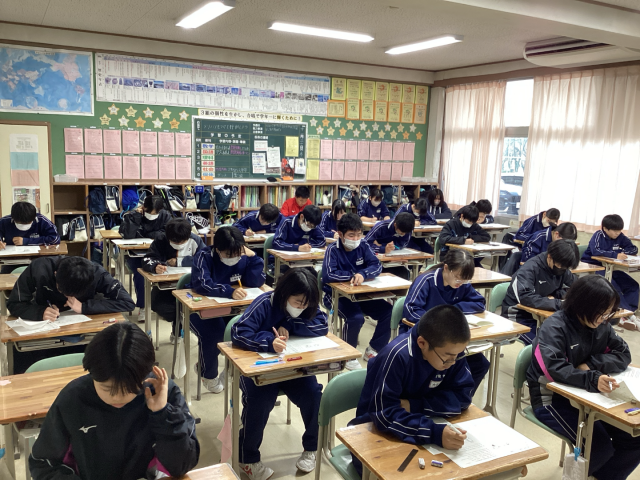 今日1,2年生は第3回目の定期テストで、5教科のテストを受験しています。今回の写真は、2年生全クラスの様子を掲載しました。3年生は実力テストを受験しています。これまでの学習の成果を発揮できるよう頑張ってほしいです。