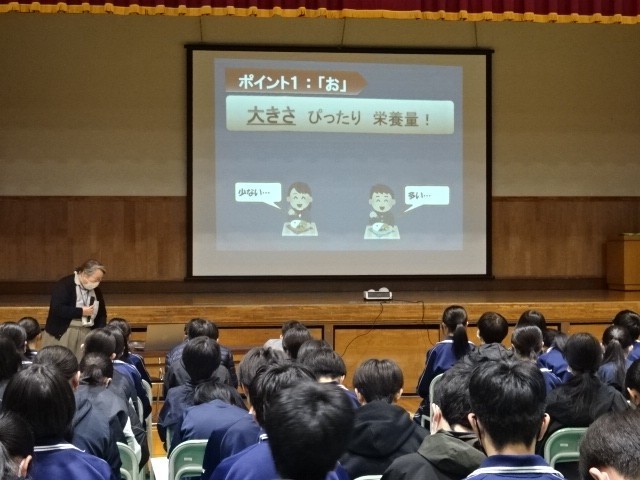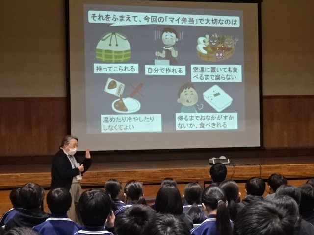 講師に給食センターの方をお招きして、お弁当づくりのポイントを教えていただきました。