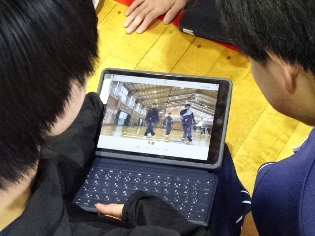 生徒たちは自分たちで動きを創作し、動きをタブレットで確認しながら、2分30秒のダンスを作っています。
