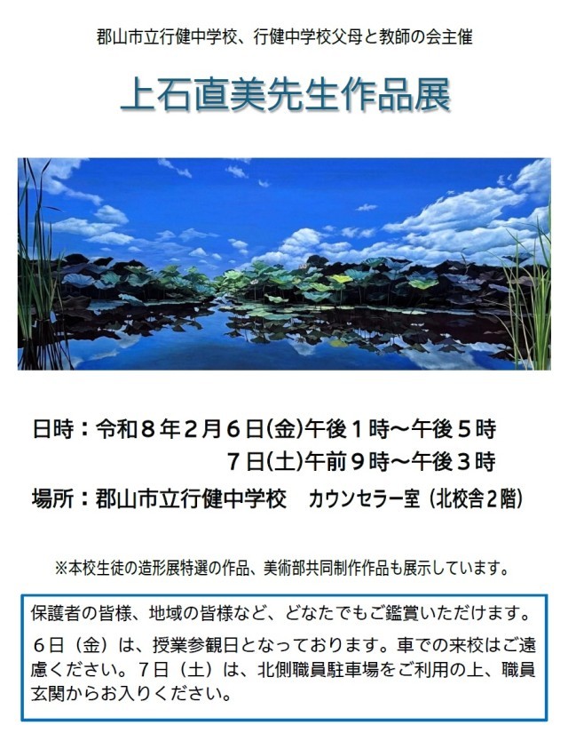先生は、2025年度第109回二科展で会員賞を受賞、また、これまでの美術科教員としての手腕を高く評価され、福島県教育委員会より令和7年度優秀教職員として表彰を受けることとなりました。 今回の二科展会員賞受賞作品も展示します。どなたでも、鑑賞できます。ぜひ、本校までお出かけください。