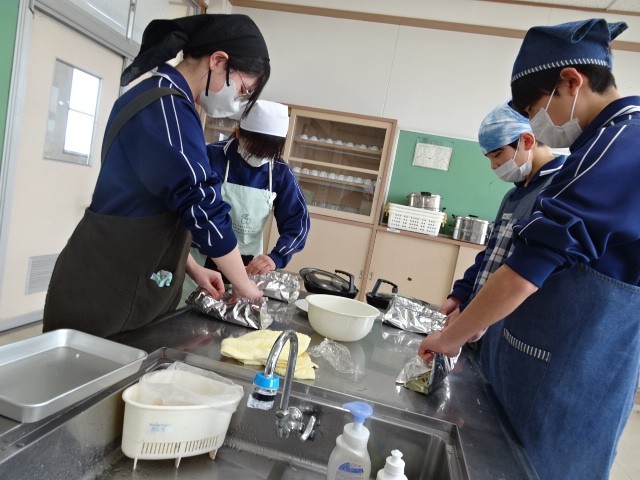 昨日に続き、今日は2年4組で調理実習。「白身魚のムニエル」に挑戦です。