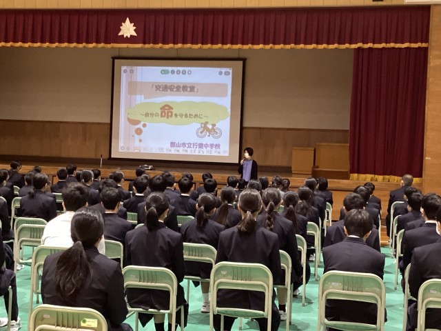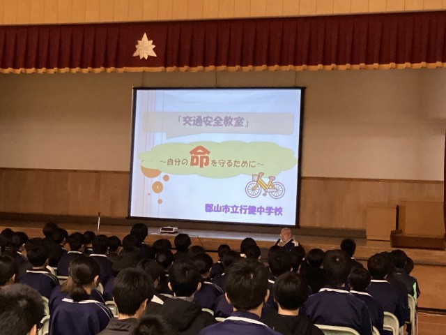 本日、全学年を対象に交通安全教室を実施しました。生徒たちは、自転車安全利用5則など、自転車を運転する際の注意事項や通学路上の危険箇所について、各学年の担当の先生の話に真剣に耳を傾けていました。交通事故の危険性を自分事として捉え、一人一人が自分の命を自分で守る力を身に付けて欲しいと思います。
