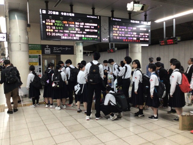 新幹線が上野駅を出発しました。郡山駅着16:17。到着後、東口まで移動して自分の荷物を受け取り、16:50頃解散予定です。