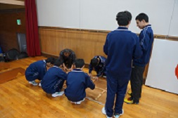 入学式の式場作成です。3年生は全員で、学級ごとの役割分担にしたがって作業を進めていきます。新入生の座席を並べたり、来賓席を作ったり、看板を取り付けたりしています。