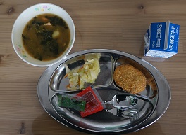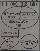 4月11日(木) 本日の給食です。「コッペパン」、「いちごジャム」、「カレーワンタンスープ」、「卯の花コロッケ」、「春キャベツのサラダ」、「牛乳」です。