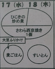 4月17日(水) 本日の給食です。「麦ごはん」、「大豆ふりかけ」、「すいとん」、「さわら西京焼き」、「ひじきの炒め煮」、「牛乳」です。