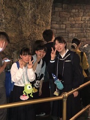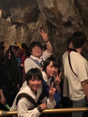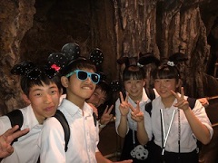 センターオブジアースの前で。待ち時間70分ですが、生徒は楽しそうです。