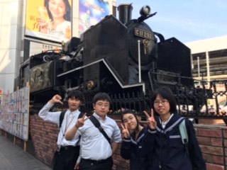 集合場所に最初の班が到着しました。新橋駅前のシンボルとなっているSLの前です。ちなみにこの蒸気機関車の形式は「C11」です。駅を出てすぐに目に入るので、集合場所として最適ですね。