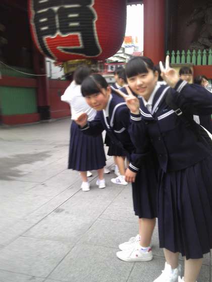 雷門での一コマ。有名な場所ですね。雷門とよばれる所以は不明なのだそうですが、元々は「風雷神門」が正式名称だったようです。理由は、写真には一部しか写っていないのですが、風神と雷神を門の左右に奉安しているためだそうです。創建年代は一説によると942年に建立されたそうですが、現在のものは昭和35年に再建されたとのこと。