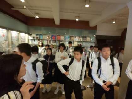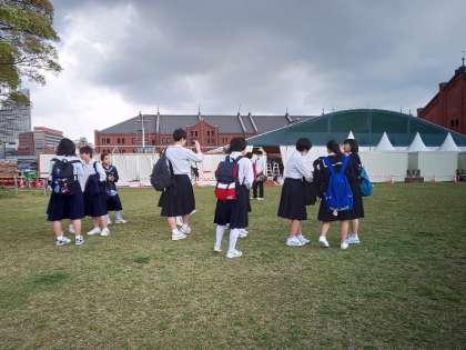 横浜での4組の様子です。遠くに赤レンガ倉庫が見えますが、多目的スペースなどでは演劇やコンサート等の催し物が開催されている施設です。また、ショッピング施設も充実しており、ここで買い物をする生徒も多いようです。