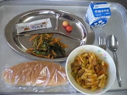 6月20日(木) 本日の給食です。「コッペパン」、「キャラメルクリーム」、「牛乳」、「マカロニのミートソース煮」、「海藻サラダ」、「さくらんぼ」です。