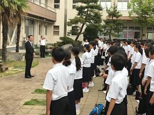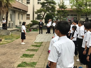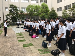 1年生は、「たくさん楽習しよう!喜多方探検隊」をテーマに、喜多方方面へ出発しました。写真は、出発式のようすです。