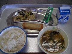 「麦ごはん」「有明のりの佃煮」「牛乳」「春巻き」「小松菜のナムル」「太平燕(タイビーエン)」です。