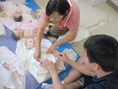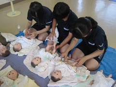 おむつ交換のしかたも学んでいます。妊婦ジャケットを使った疑似体験は男子生徒も体験して大変さを実感したようでした。