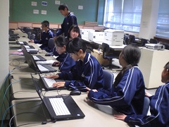 11月25日に予定されている1日体験入学に向けて、生徒会役員の生徒がしおり作成をしています。パソコンを使って、小学6年生にもわかりやすい説明になるように話し合いながら進めています。