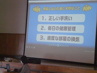 新型コロナウイルスへの対策について、養護教諭から学年ごとに講話を行いました。動画を交えた具体的な説明を、皆真剣に聞いていました。