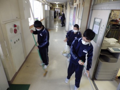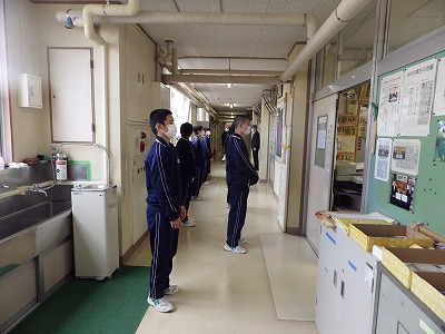 校内の清掃の担当も各学級で決り、清掃活動が始まっています。職員室担当の生徒の様子を掲載します。これまでの先輩方と同様、全員が一生懸命に取り組んでいます。例年と異なるのは整列です。三密を防ぐために、横一列ではなく,交互に整列しています。新しい整列の仕方ですが、自主的に整列することができています。