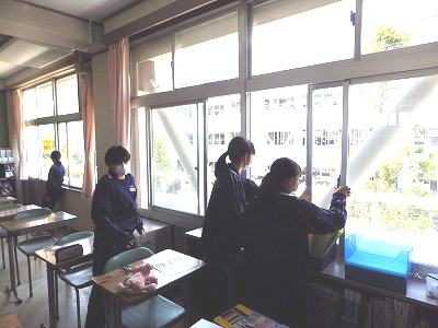 3年生が、移動教室から戻ってきて一番最初に換気を行っていました。一人ではなく複数の目で気を配っています。