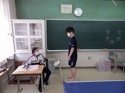2年生の身体測定が行われています。3密にならないように、測定場所には最大で5人、間隔を取って入室しています。
