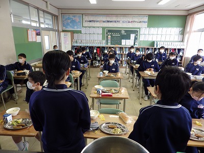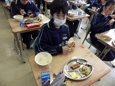 給食の様子です。本日はシチューとパンがメインの給食でした。一人の男子生徒にインタビューしましたが、特にシチューがおいしいとのことでした。嫌いな者は特になく、毎日の給食が楽しみだそうです。