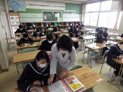 1年2組の理科の授業の様子です。1校時開始早々ミニ問題に取り組んでいます。花の構造についての問題ですが、既習事項を振り返ることのできる工夫がなされていました。教科担当もさりげなくヒントを出すなど、全員に目を配りながら支援しています。