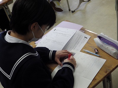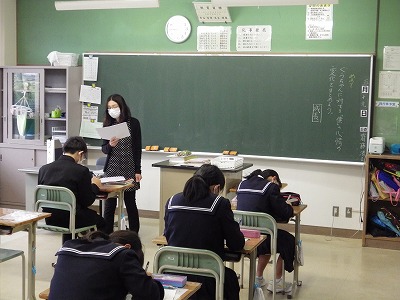 2年4組の国語の様子です。2年生になって初めて学習する文学的作品です。めあてを提示し、学習プリントを活用して主人公の心情の変化をとらえる授業です。発問を工夫することで多様な考えを引き出せる工夫がなされています。みんな熱心に自分の考えを整理しています。