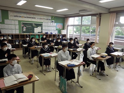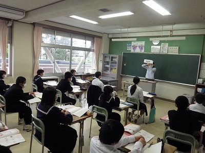 2年3組の英語の授業です。英単語の発音を確認しながら、それぞれの単語の意味や、発音上の注意点の説明を集中して聞いています。全員がカードを見つめている様子がとても印象的です。