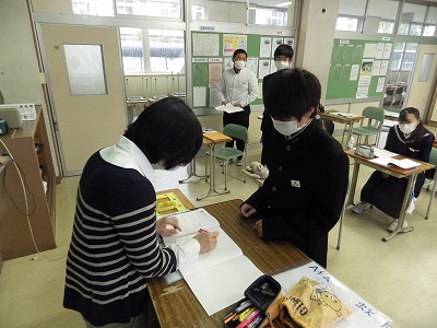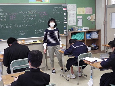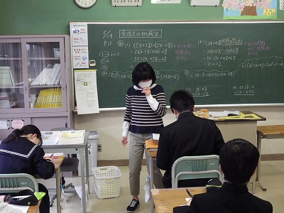 2年1組の数学の授業です。多項式の加減法について学習しています。教科書にある練習問題に一生懸命に取り組んでいます。答えの導き方や、つまずきがないかなどを担当教師が一人一人の解答を確認しています。添削を加えることで理解が不足している箇所を家庭で再確認しやすくしています。