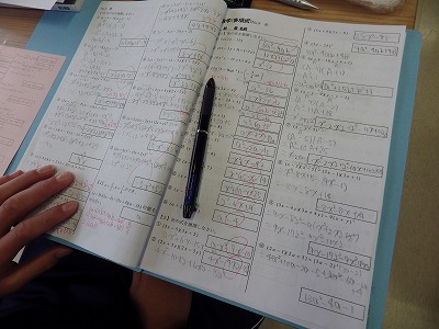 3年1組の数学の授業です。導入では面積の計算をさせ、最も効率のよい解法を確認することで因数分解の説明を行っています。また、これまでの学習プリントを見ると、問題を数多く演習させて計算力の定着を図っていることがわかります。