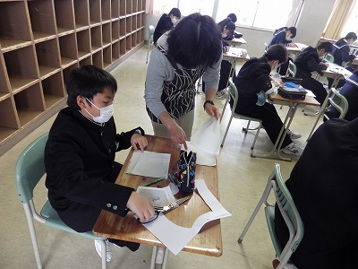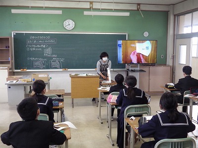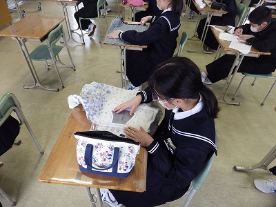 1年4組の家庭科の授業です。実物投影機を活用し、細かな作業をモニターに映すことで生徒の理解が深まっています。実際に作業する上でも具体的な指示を出し、より良い作品が仕上げられるよう支援しています。