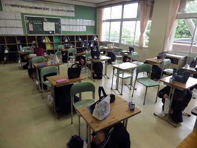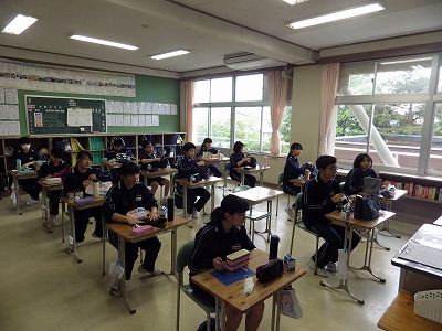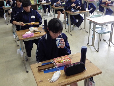 2年4組の昼食の様子です。今日から金曜日まで牛乳が生徒に配られることになりました。久しぶりに学校で飲む牛乳は「おいしいです。みんなと学校で飲む牛乳は格別です。」とのことでした。また、食事前に突然地震が発生しましたが、教員の指示を待つまでもなくあっという間に全員が机の下に避難しました。隣の3組も同様でした。行健中学校の生徒は全員避難訓練を真剣に行うので、その成果だと強く感じました。