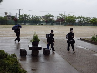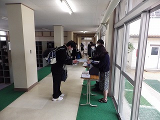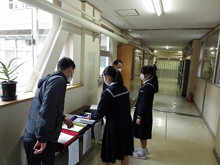 本日も小雨が降っており、あいにくの天気ですが分散登校のBグループの生徒が時間をしっかり守り登校しています。各学年ごとに担当教師へ検温表を提出し、教室に向かっています。